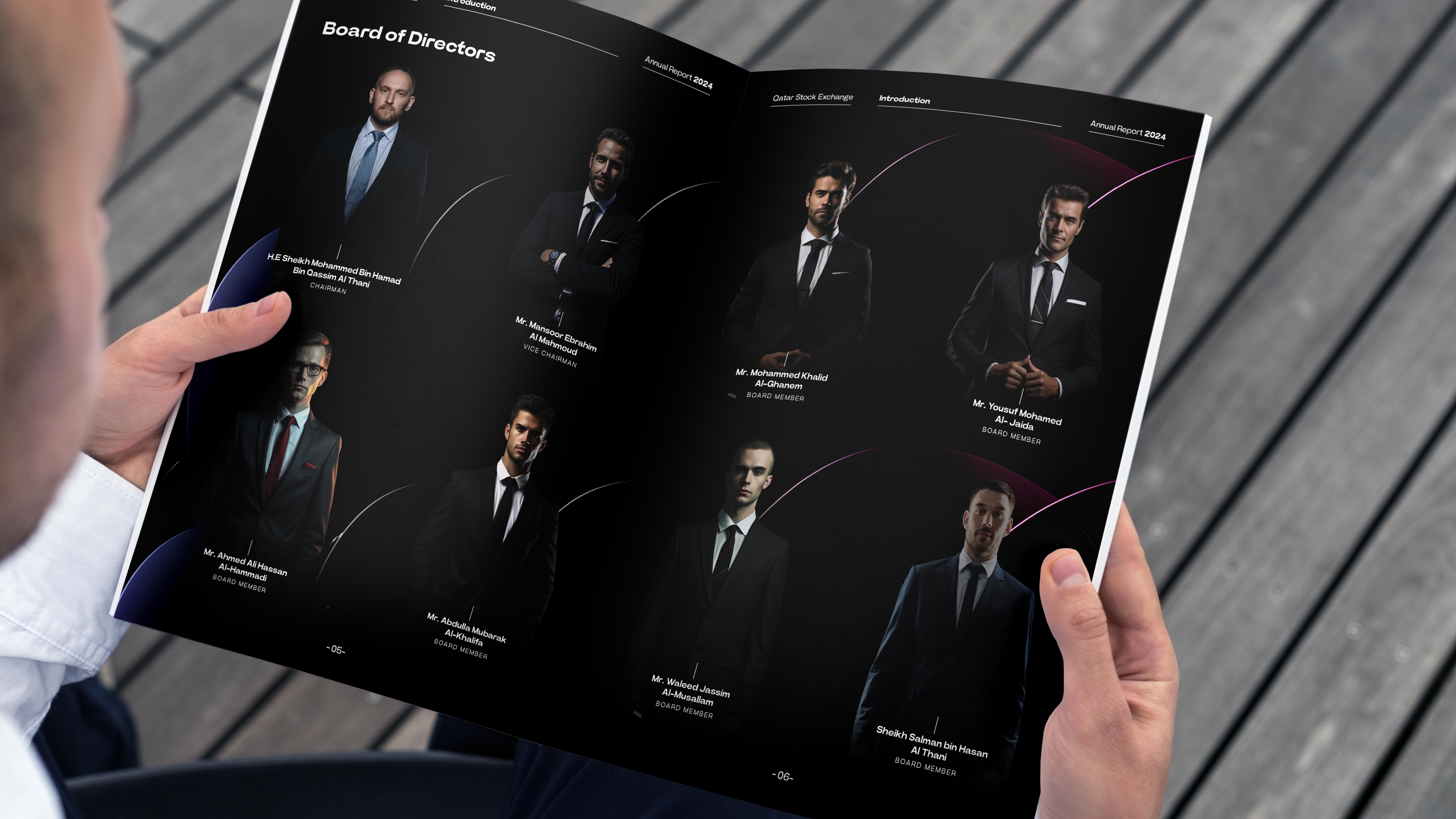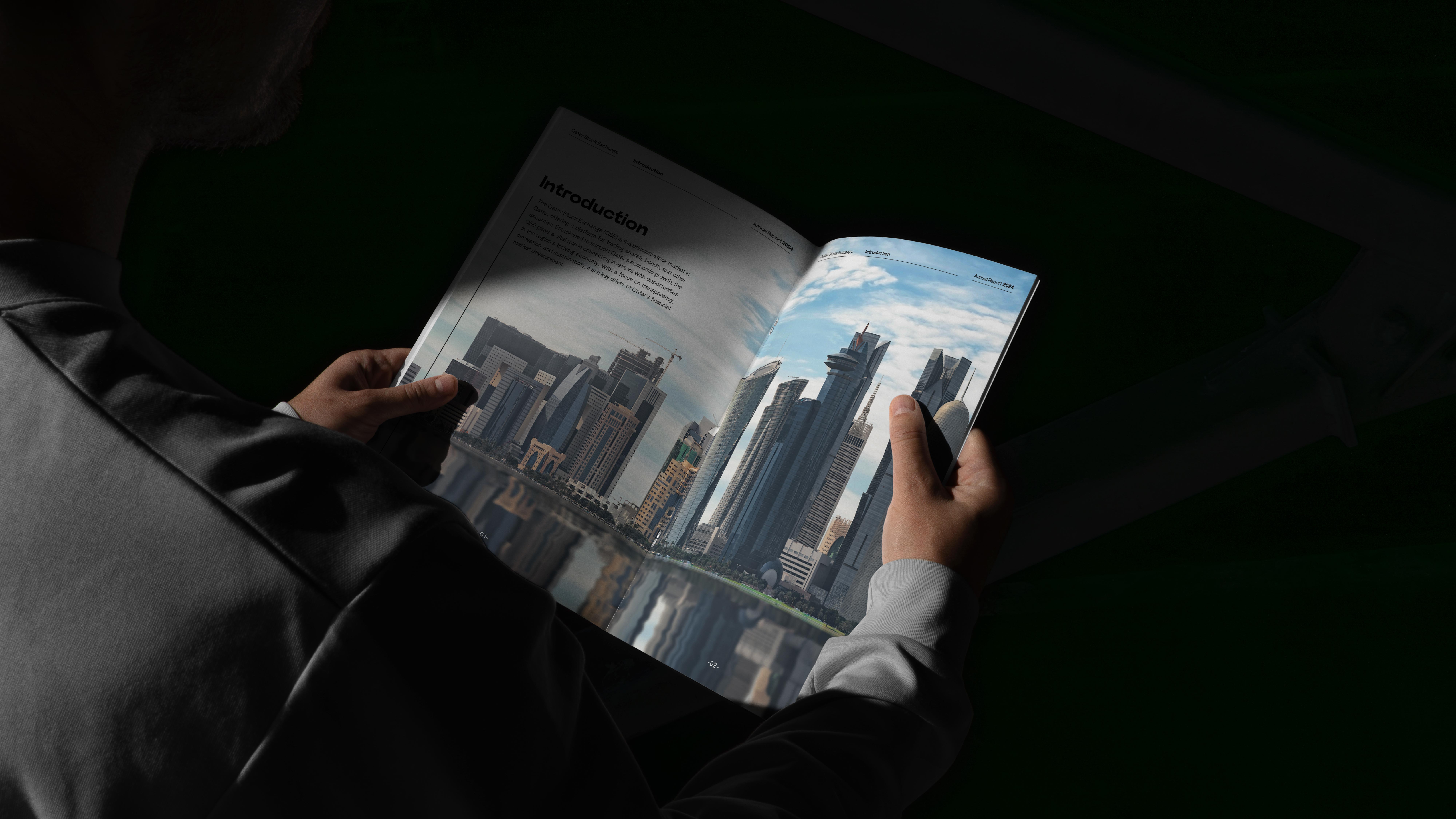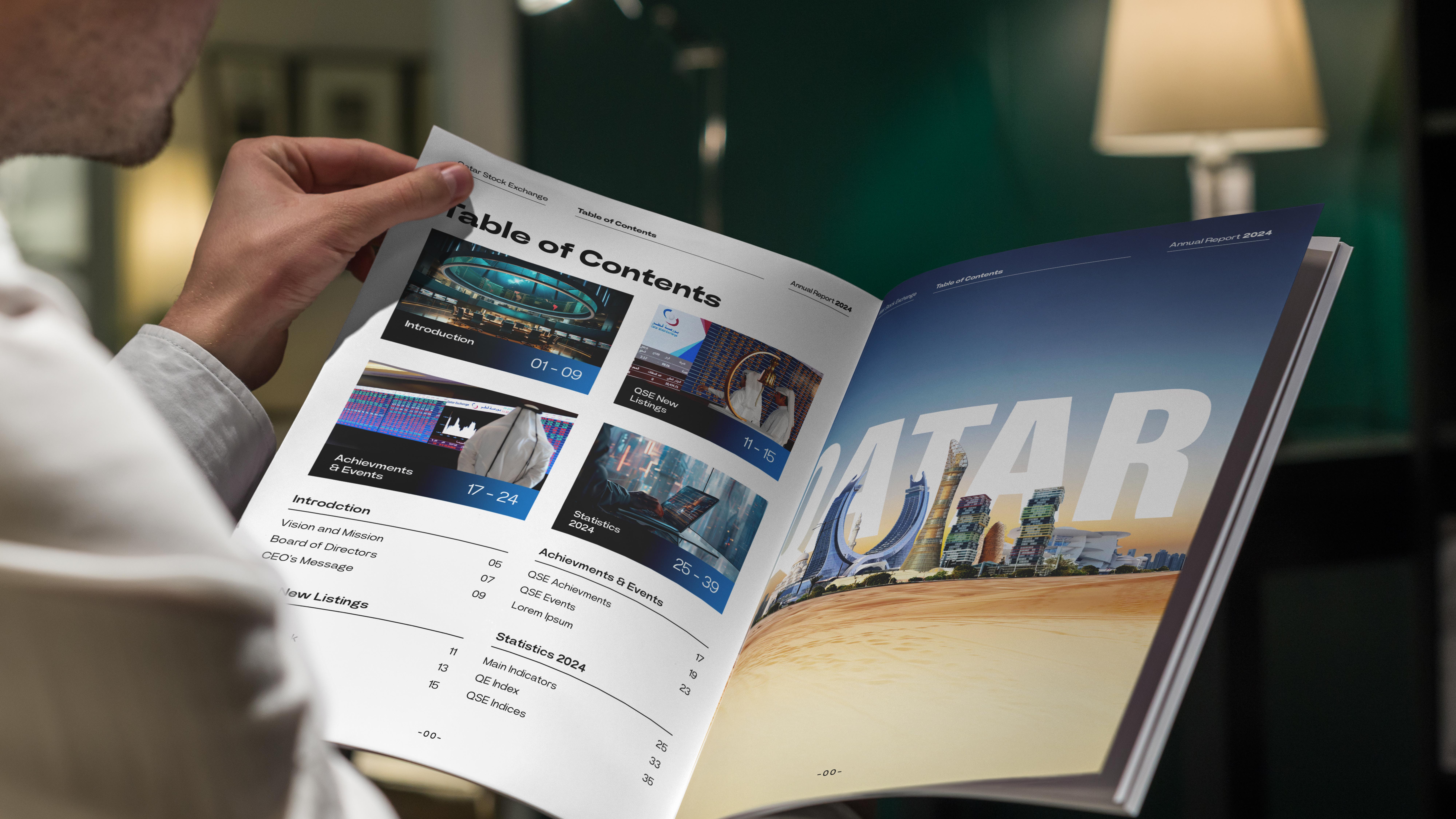 A creative proposal for QSE’s Annual Report, designed to present financial data and achievements with clarity and impact. The concept uses a refined grid system, bold typography, and a balance of visuals and infographics to modernize the publication while keeping it professional and accessible.